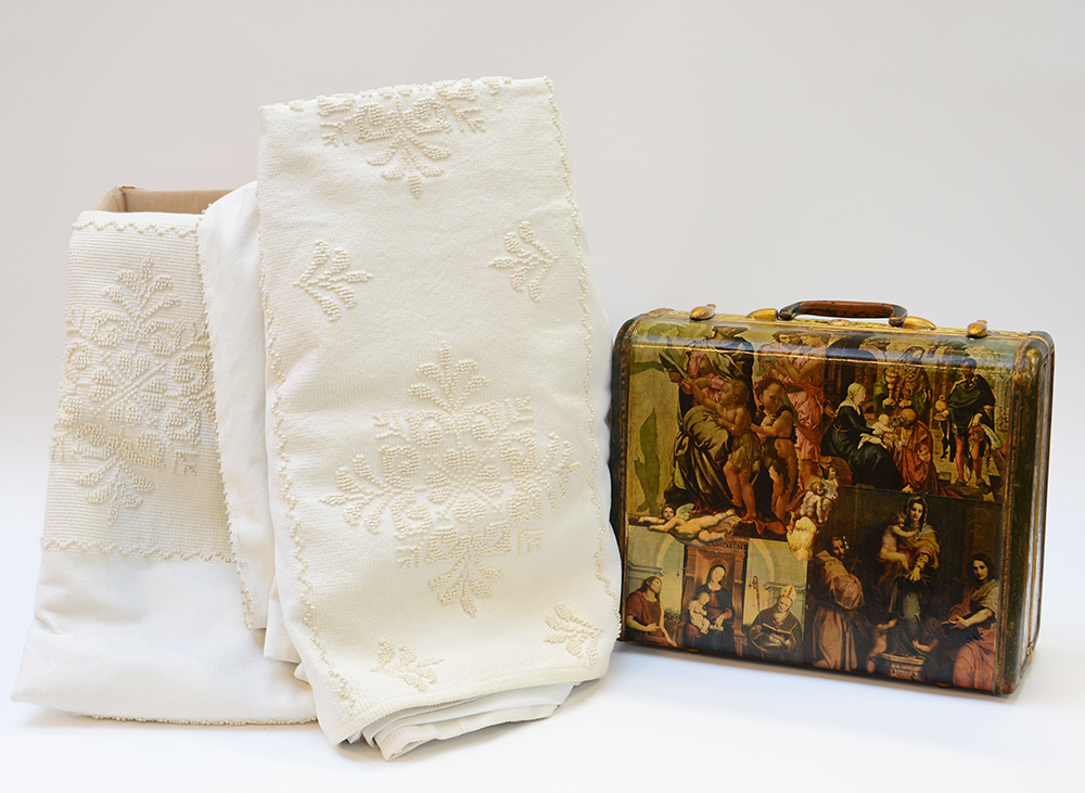 Lotto composto da una valigetta decorata a decoupage e un cartone con tendaggi (difetti)