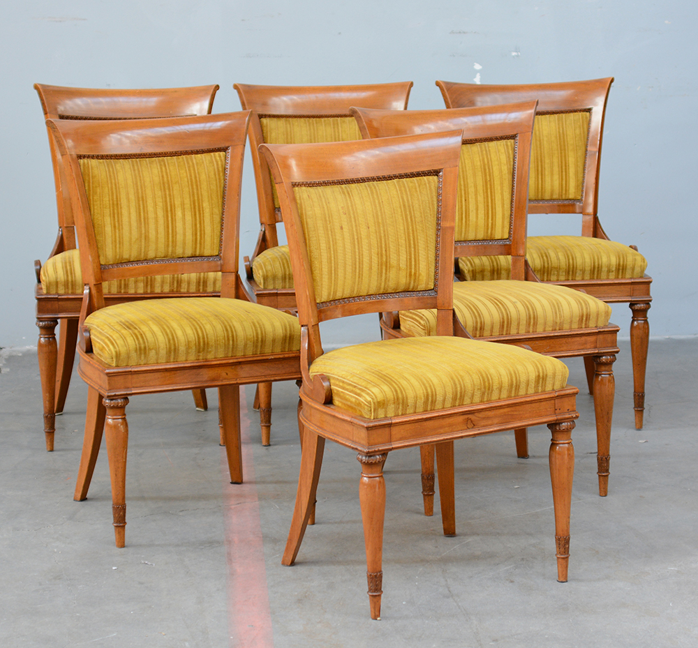 Gruppo di sei sedie in noce con seduta e schienale rivestite in tessuto color senape. Secolo XX (difetti)