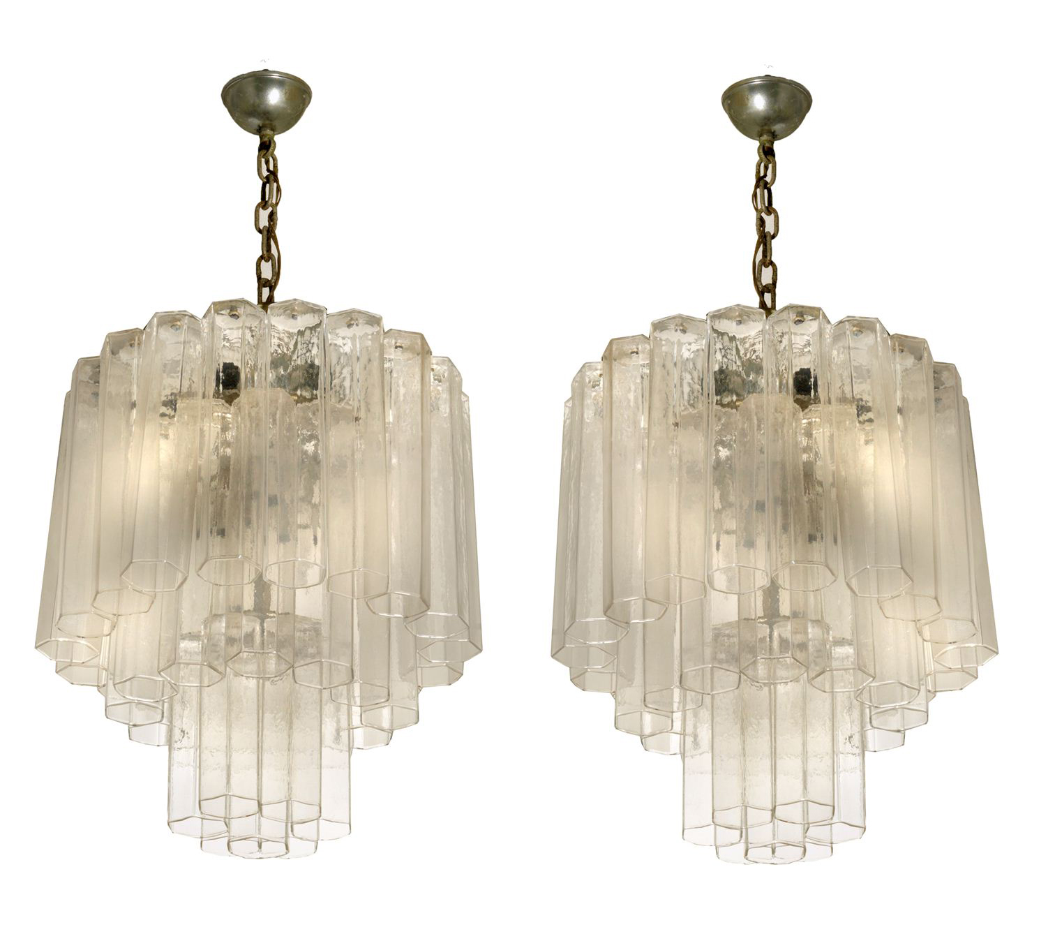 Coppia di lampadari in vetro di Murano a quattro ordini di elementi esagonali soffiati in stampo.