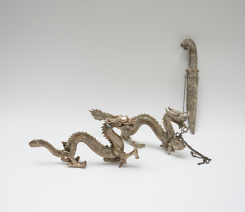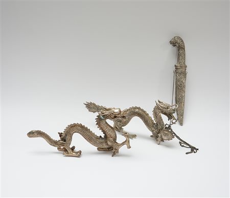 Lotto composto da coppia di sculture in metallo a forma di draghi e un pugnale teatrale (difetti) Cina, sec. XX (l. max 40 cm.) -EN .