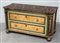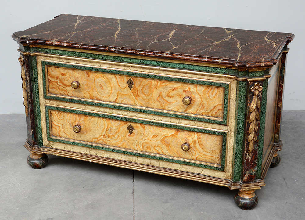Comò basso a due cassetti in stile seicentesco realizzato in legno dolce laccato e dipinto a finto legno con piano e fasce marmorizzate, piedi a cipolla. Secolo XX (cm 124x68x55) (lievi difetti)