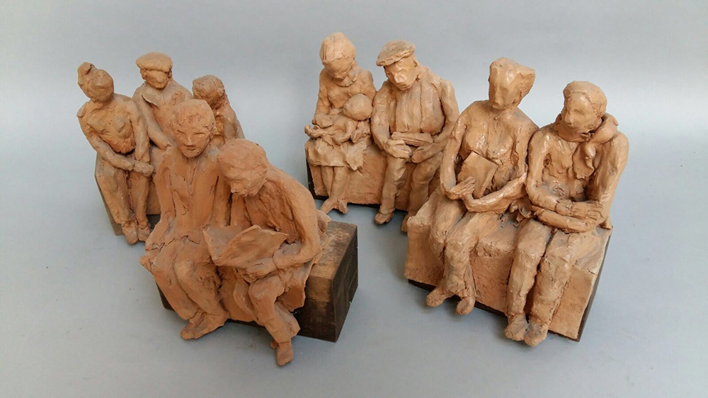 Magnaghi Matilde Lotto di quattro sculture in terracotta raffiguranti gruppi di persone sedute in attività differenti, supporti in legno (h cm max 26) (difetti)