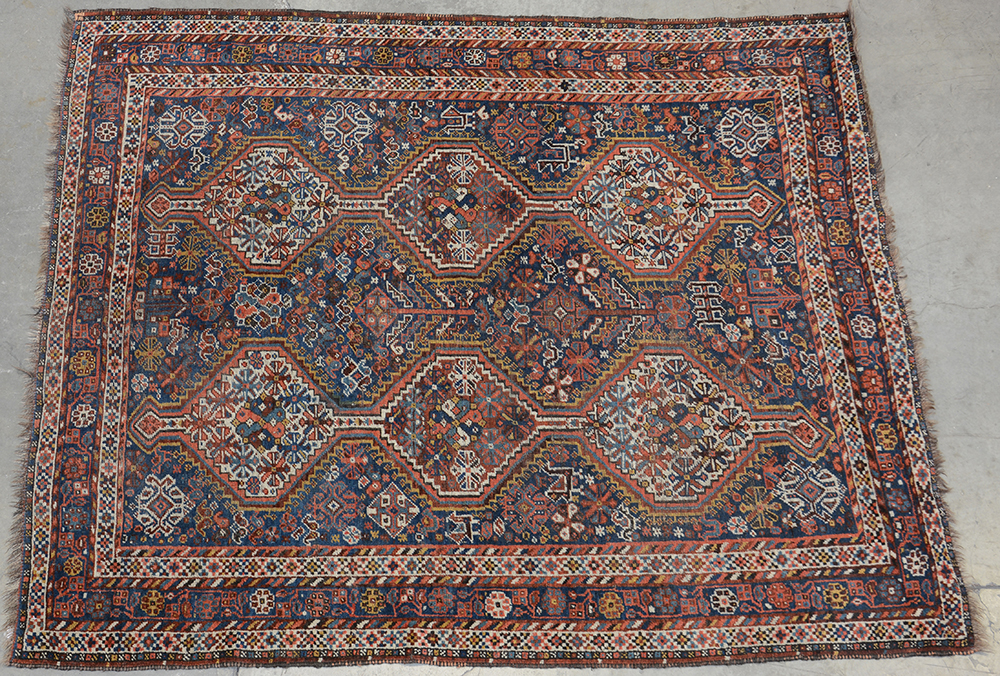 Tappeto Shiraz, Persia fine secolo XIX Disegno a file di medaglioni con fondo bianco e rosso su campo blu, cosparso di fiori, pavoni e boteh (cm 188x160) (difetti)