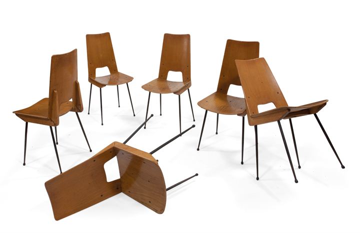 Sei sedie in compensato di rovere, struttura in legno di faggio e metallo laccato nero.