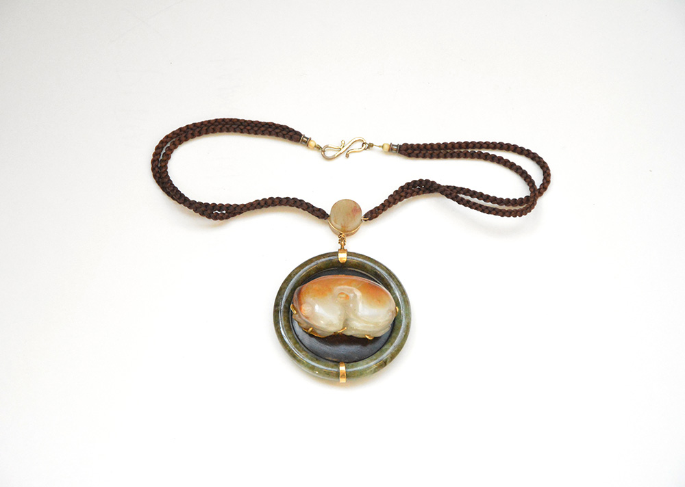Pendente in giadeite "grasso di montone" a guisa di gatto montato in metallo giallo e anello di nefrite verde g. 123,30 diam. cm 6,80 (tracce di colla)