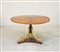Tavolo "impero" con ripiano corcolare in noce e radica di noce. Base tripode decorata con tritoni intagliati e dorati a tutto tondo (diam. cm 121x h 76) (difetti)