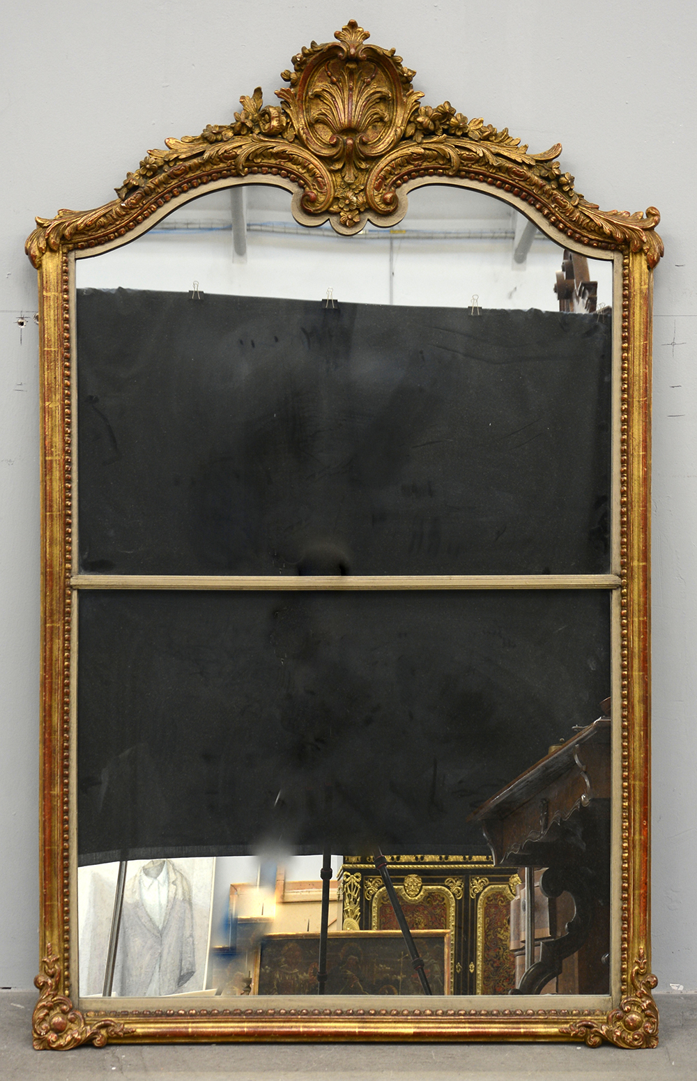 Specchiera in legno e pastiglia dorata con angoli e parte superiore a decoro rocaille, specchio a due lastre (cm 88x140) (difetti)