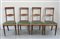 Gruppo di quattro sedie intarsiate con schienali a giorno e seduta in velluto verde (difetti)
