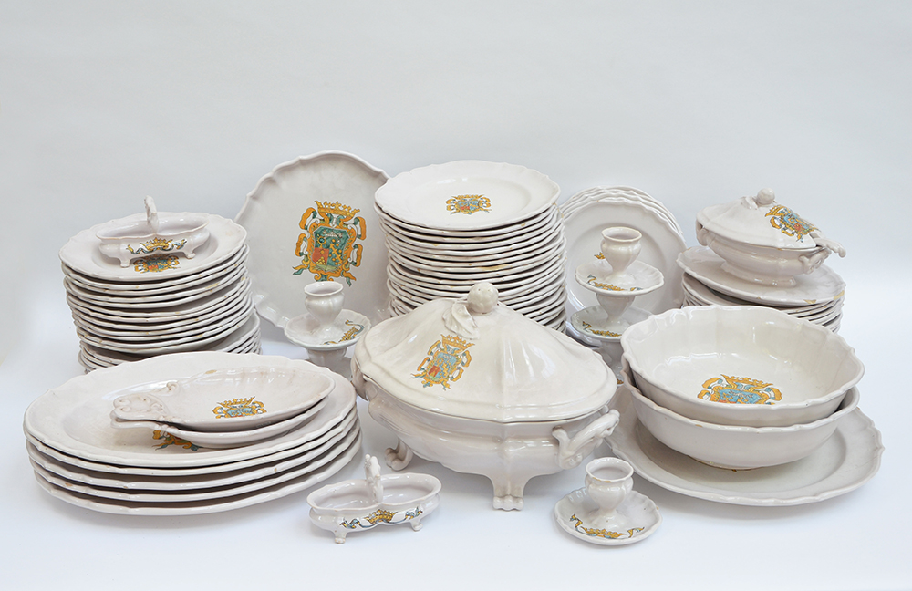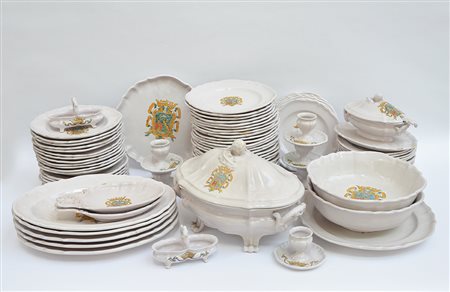 Manifattura di Faenza, parte di servizio da tavola in ceramica bianca decorato con stemmi gentilizi composto da trentatre piatti piani e dodici fondi, venti piatti da dolce, tre alzatine, cinque piatti da portata ovali e uno tondo, un piatto per pesce, due insalatiere e due salsiere con cucchiai, una zuppiera, due raviere, quattro saliere doppie e dieci portauova (difetti)