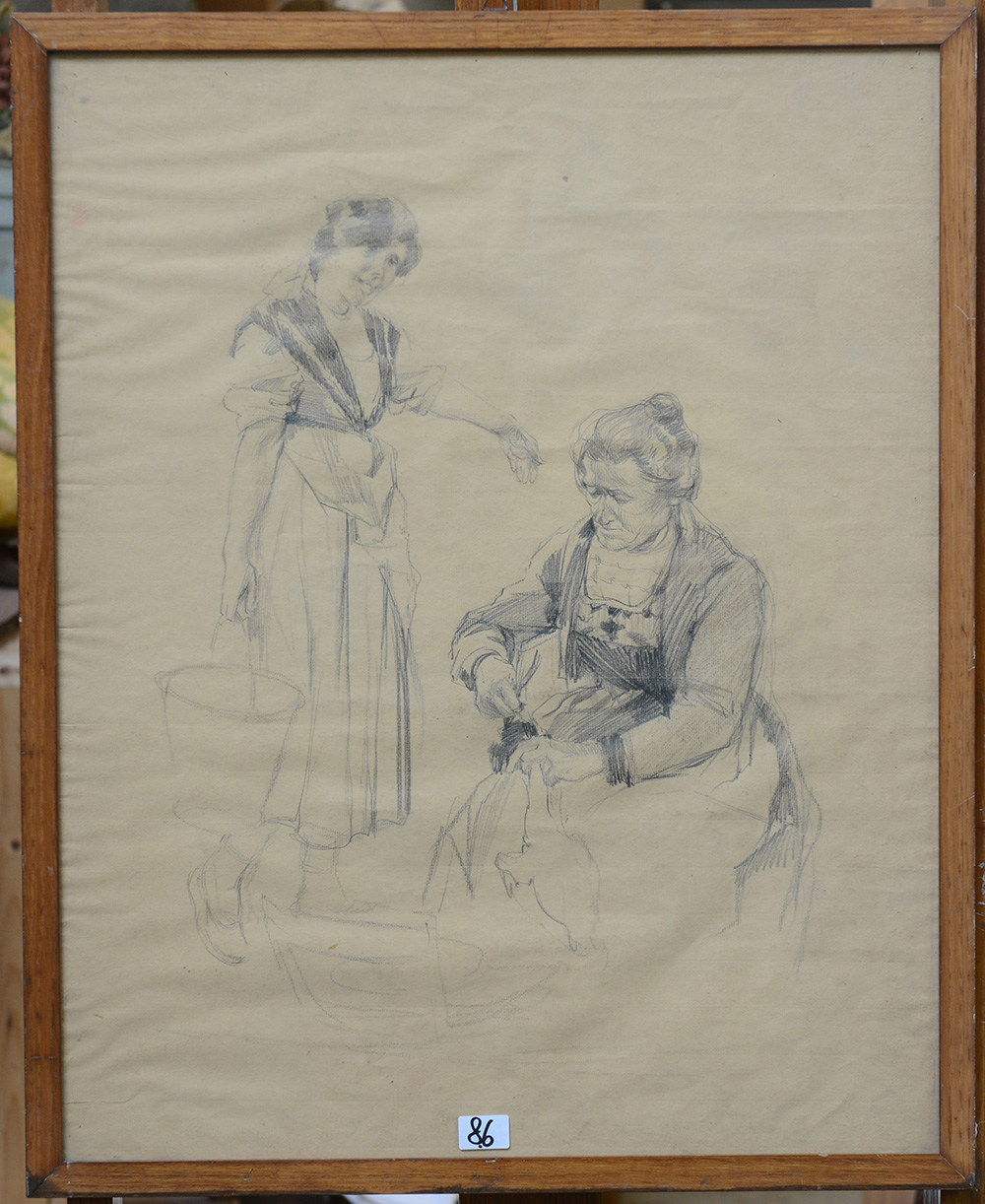 Ignoto, "La spennatura della gallina" disegno a matita grigia su carta (cm 60x48) in cornice (difetti)
