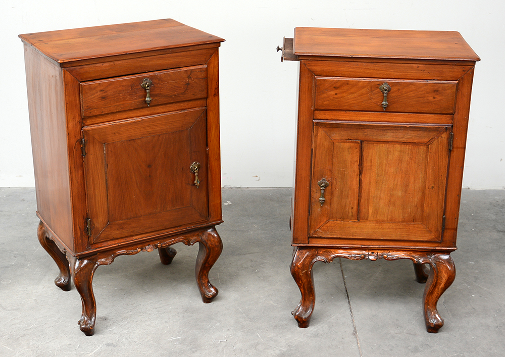 Due comodini ad un'anta ed un cassetto sottopiano, quattro gambe mosse, pianetto estraibile laterale, uno con tiretto laterale. Fine secolo XVIII (cm 46x77x32) (difetti e restauri)