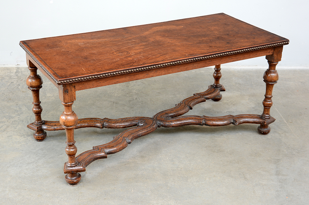 Tavolino da salotto con gambe tornite riunite da traverse sagomate, secolo XVIII e piano rettangolare rivestito in cuoio di epoca posteriore (difetti)