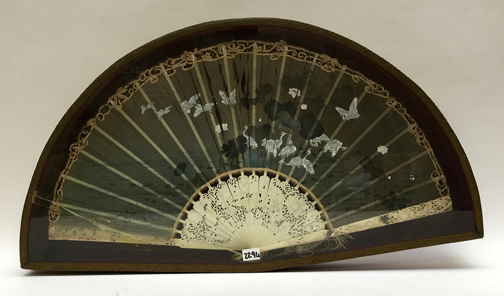 Ventaglio con stecche in madreperla traforata a volute con rilievi in oro, pagina in carta dipinta con scene galanti e di corte, teca in vetro. Secolo XIX (lievi difetti)