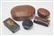 Lotto composto da due scatole di misura diversa, rivestite in pelle e monogrammate unite a tre tabacchiere in materiali diversi, misure e decori differenti (difetti)