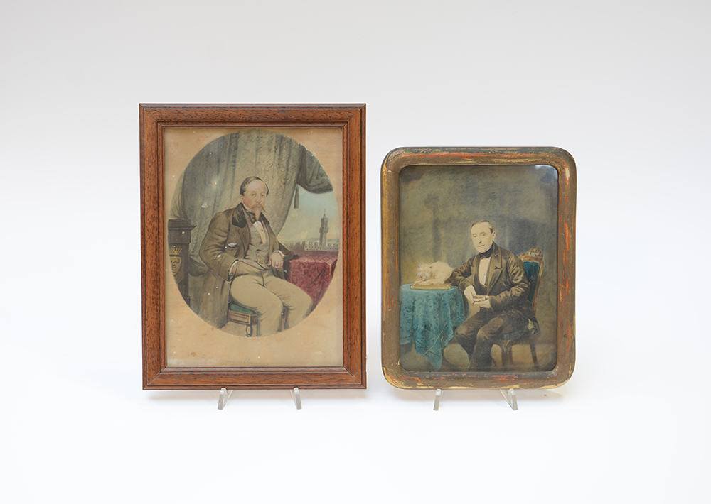 Lotto di due acquerelli del secolo XIX raffiguranti ritratti di gentiluomini (cm 21x16 e 20x16,5) in cornici (difetti)