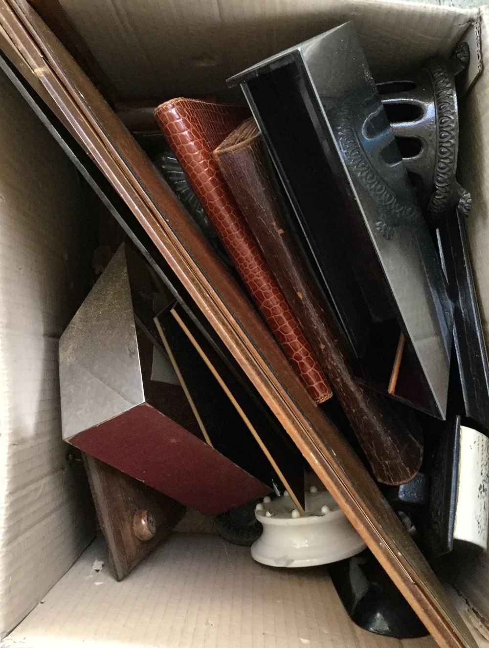 Cartone contenente numerosi oggetti per la scrivania (difetti)