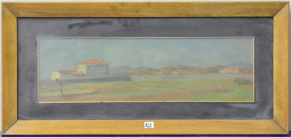 Adone Comboni (Riva Di Trento 1880 - Merate 1959) "Paesaggio con case" olio su cartone (cm 19x63) Firmato in basso a destra. In cornice