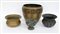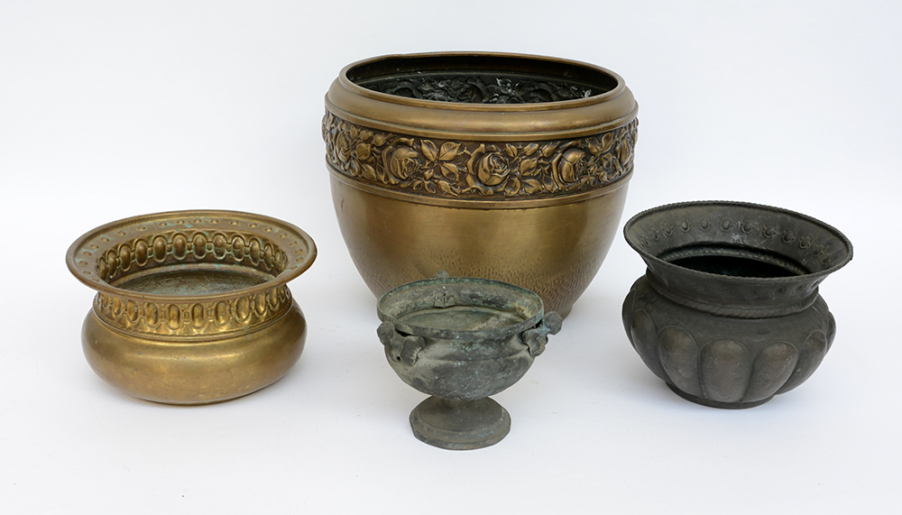 Lotto 148 | Lotto composto da tre cachepot in metallo e una base per turibolo (difetti)