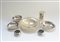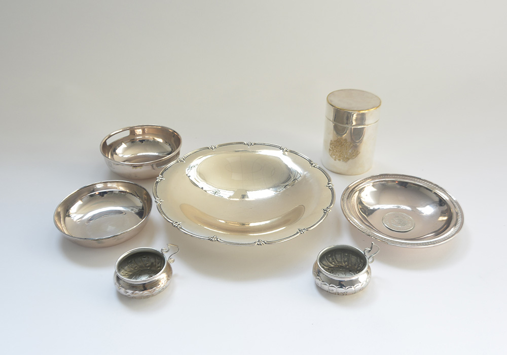 Lotto composto da tre ciotole, una scatola e due posaceneri in metallo con monete uniti ad un'alzata di forma circolare liscia con bordura modanata a volute e palmette (d. cm 23) (g 190 ca.)