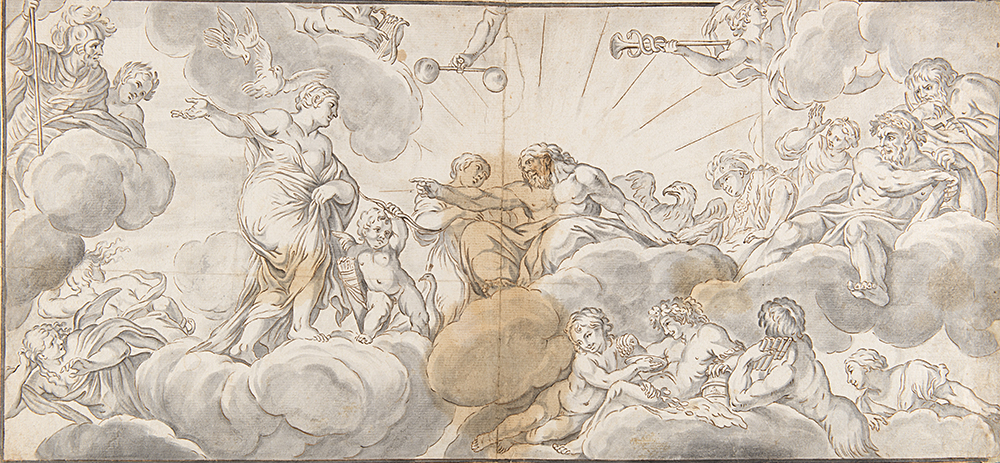Artista del secolo XVIII "Divinità dell'Olimpo" penna inchiostro bruno, acquerello grigio (mm 270x560) Al verso un altro studio con la stessa tecnica (difetti) -EN 18th-century artist "Olympus Gods" pen, brown ink, grey wash (mm 270x560) Another study in the same technique on verso (defects)