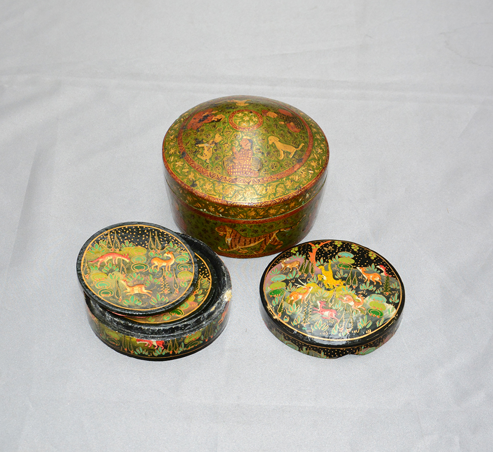 Lotto composto da due scatole laccate, una russa contenente dei sottobicchieri ed una persiana decorata con figure e animali, misure differenti (difetti)