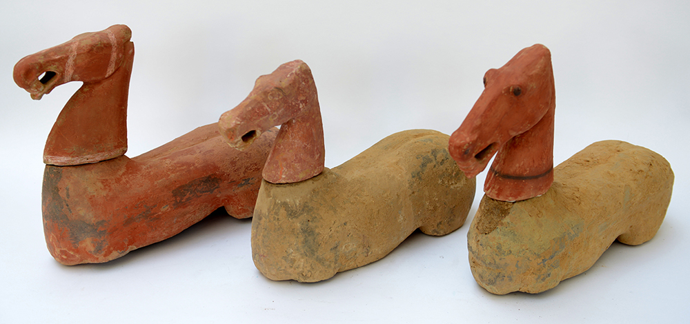 Manifattura cinese Lotto di tre cavalli con teste rimovibili in terracotta...