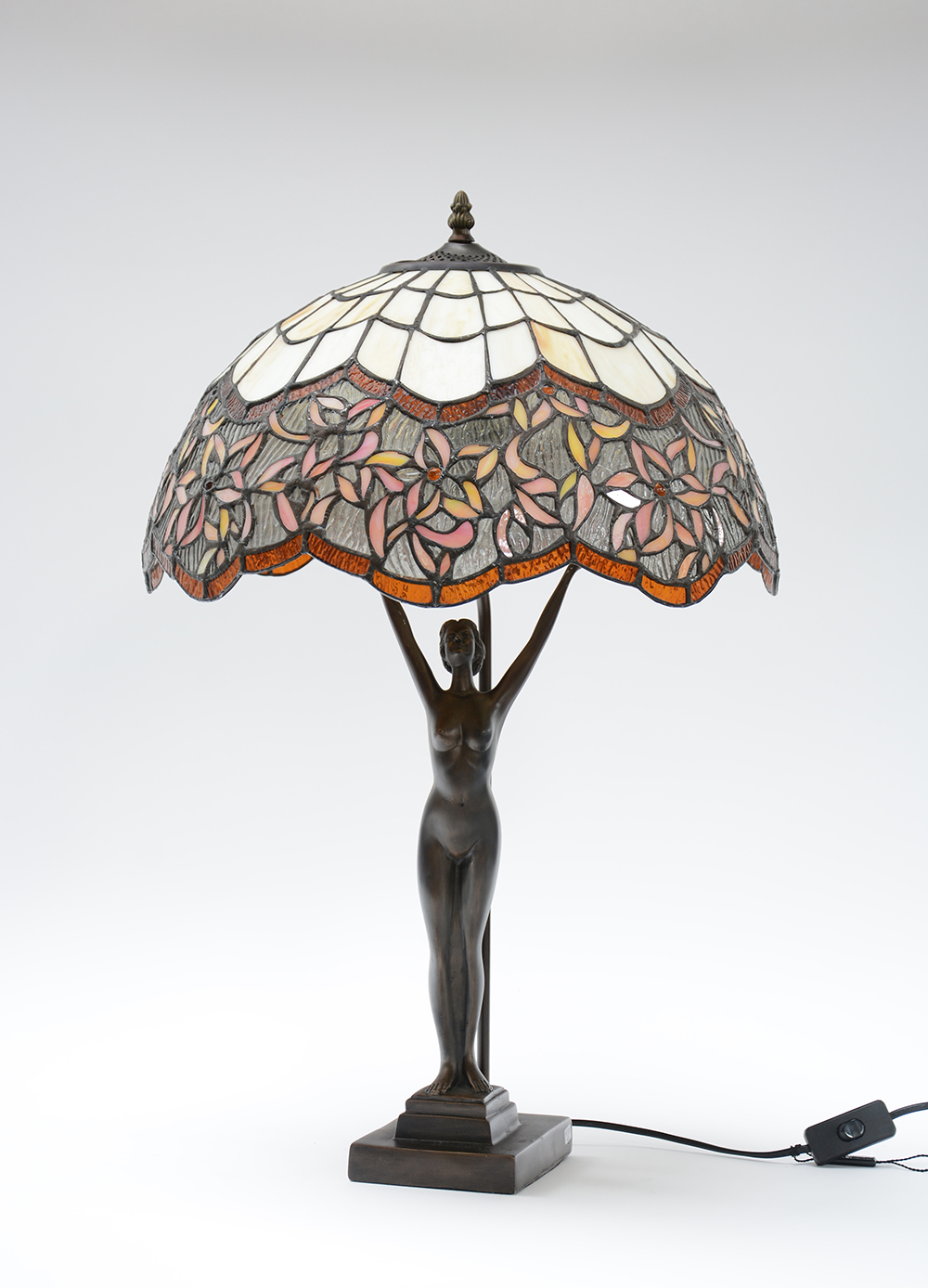 Lampada da tavolo a una luce di gusto liberty con montante a figura femminile e paralume in pasta vitrea legata a piombo, produzione recente (h cm 66) (difetti)