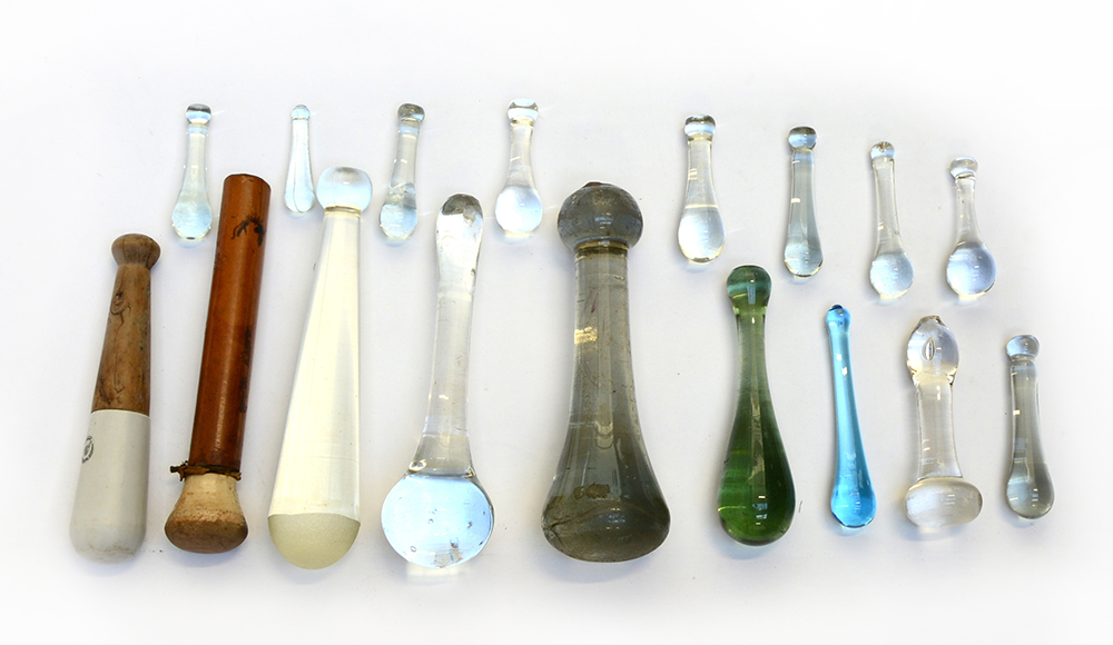 Lotto composto da quindici pestelli in vetro unito a due pestelli in legno/ceramica. (lievi difetti) -EN Fifteen glass pestles and two wooden/ceramic pestles. (minor defects)