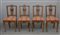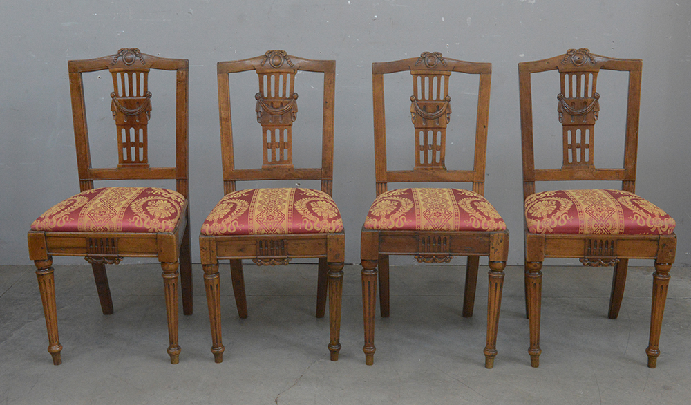 Gruppo di quattro sedie in noce con schienale a giorno intagliato a motivi di "nastro" e "tendaggi", gambe anteriori scanalate. Inizio secolo XIX (difetti)
