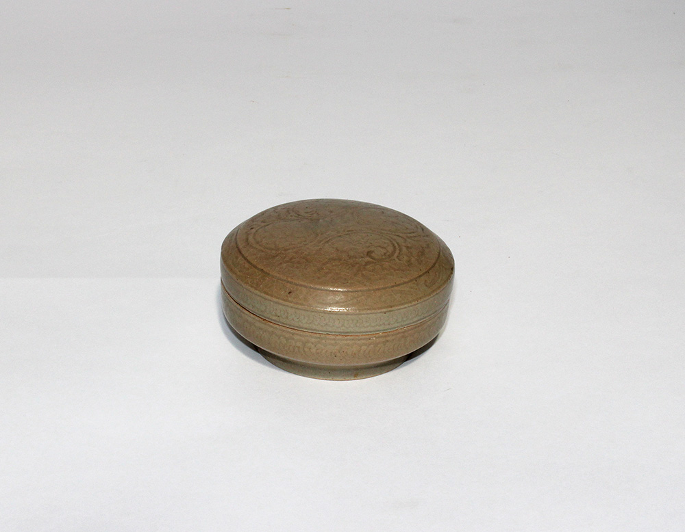 Manifattura cinese Scatola in terracotta a invetriatura celadon con decoro inciso (difetti) (d. 10 cm.)