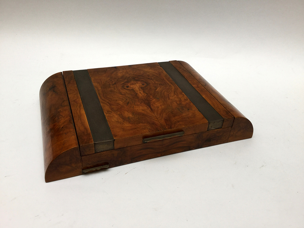 Scatola déco portagiochi lastronata in radica e decorata con guarnizioni in argento. Italia, anni '30. (cm 37x6x24) (difetti) -EN Scatola déco portagiochi lastronata in radica e decorata con guarnizioni in argento. Italia, anni '30. (cm 37x6x24) (difetti)