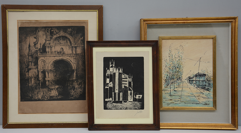 Lotto di tre litografie di soggetti e misure differenti, due firmate Follini...