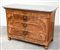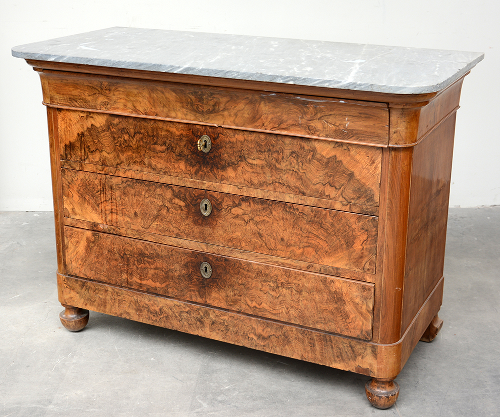 Comò lastronato in radica di noce ad un cassetto sottoiano e tre grandi sul fronte. Piedi a cipolla, piano in marmo. Sec. XIX (cm 125x93x61)(difetti)