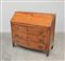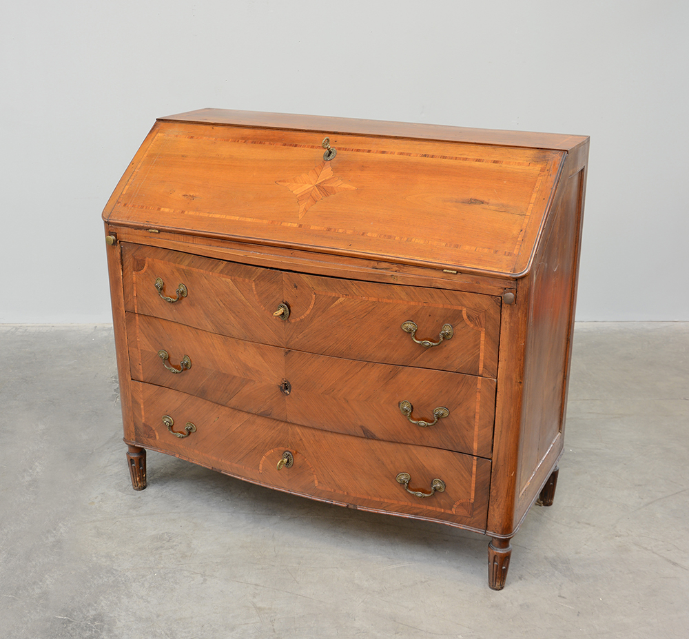 Ribalta in noce con fronte leggermente mosso a tre cassetti decorata con intarsio quadrilobato e filettatura. Cassettini e vani all'interno della calatoia. Quattro piedini rastremati e scanalati (cm 115x104x51)(difetti)