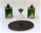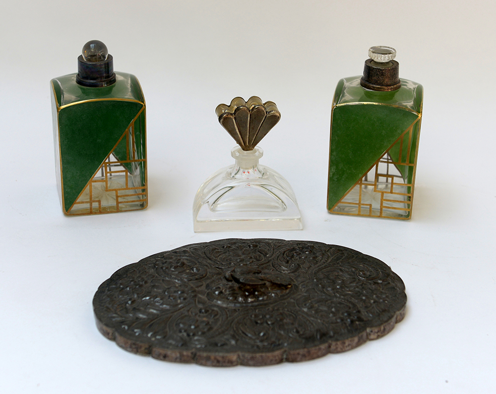 Lotto composto da una coppia di vasetti porta profumo in cristallo con decoro geometrico uno specchio a mano con cornice in argento sbalzato a motivi floreali e una boccetta con tappo a ventaglio (difetti)
