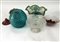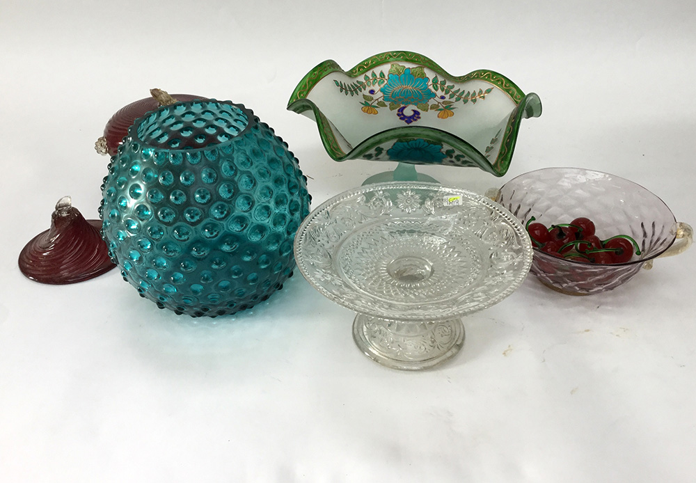 Lotto composto da un vaso bugnato, tre alzatine e una ciotola biansata in vetro di diversa forma e decoro (gravi difetti)