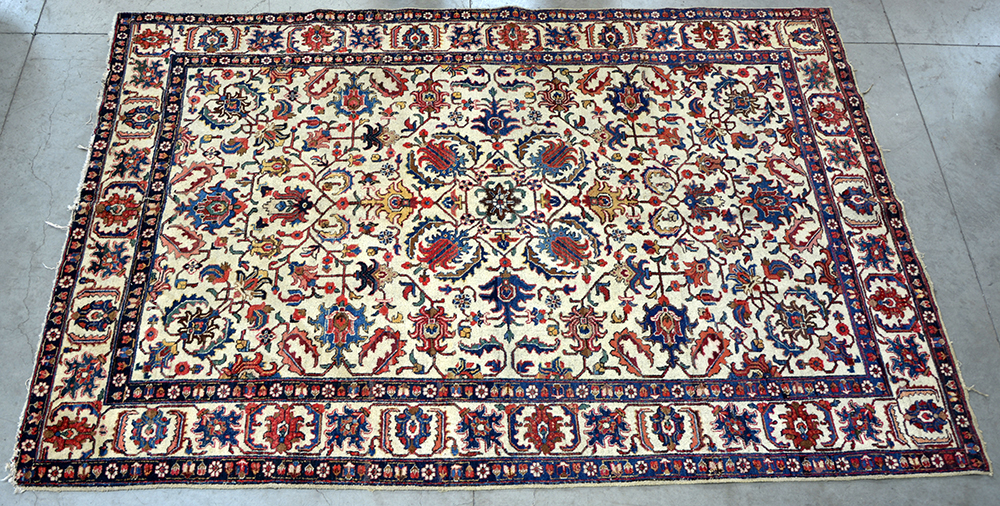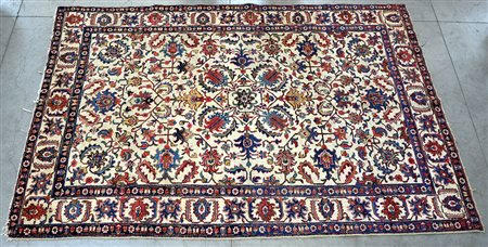 Tappeto Tabriz, Persia sec. XX Decoro all over con rami fioriti policromi su fondo bianco. Bordura Herati (cm 315x213) (difetti)