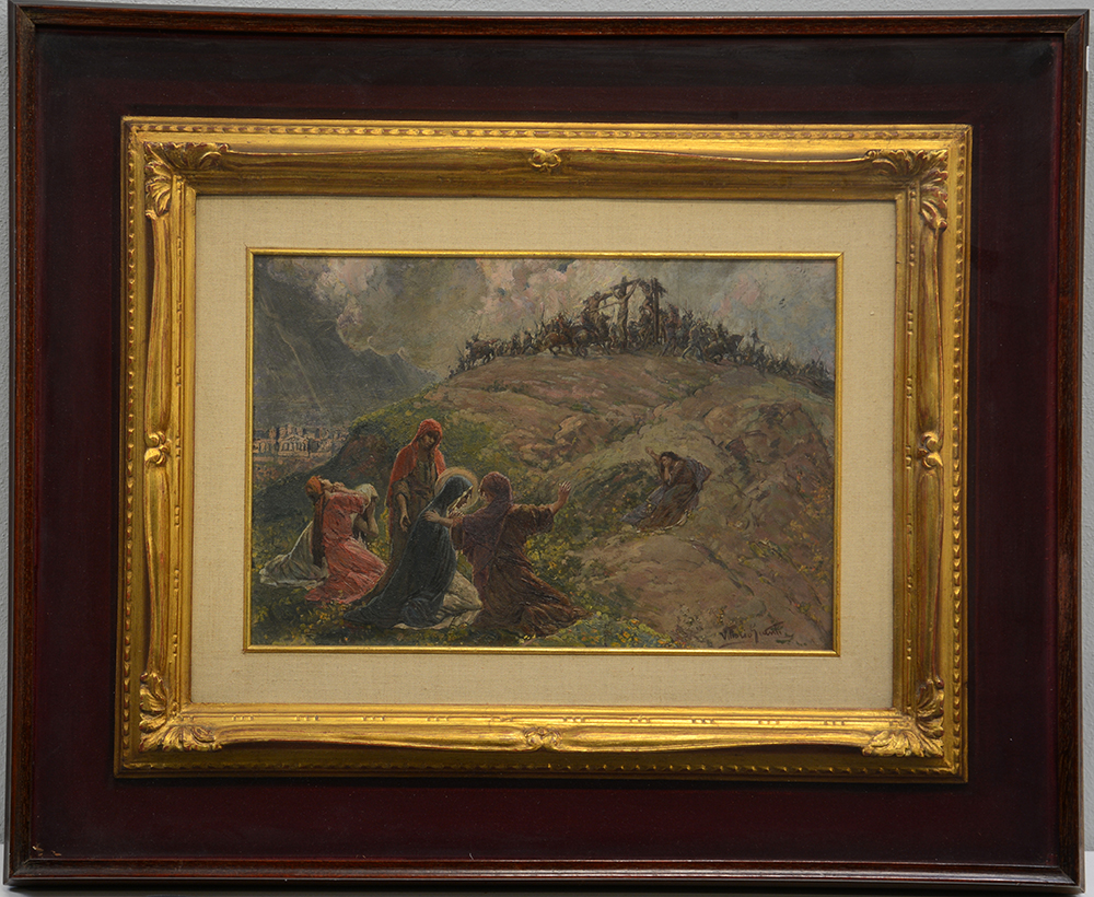 Vittorio Giunti (1894 - 1964) "Maria e le pie donne ai piedi del Golgota" olio su compensato (cm 26x39) Firmato in basso a destra. In cornice (lievi difetti)
