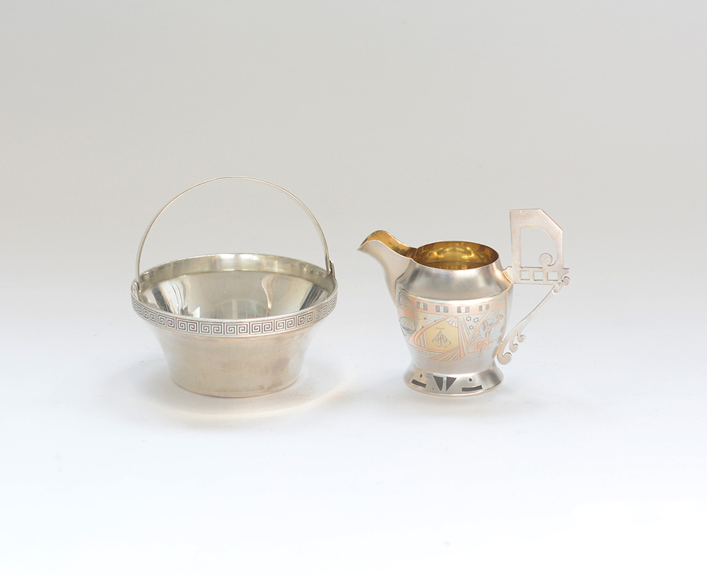 Lotto composto da un brick per il latte con superficie satinata parzialmente dorata, incisa a motivi geometrici e stilizzati unito ad un cestino con superficie liscia e bordo decorato da greca. Russia, secolo XX (h. max cm 10) (g 300 ca.)