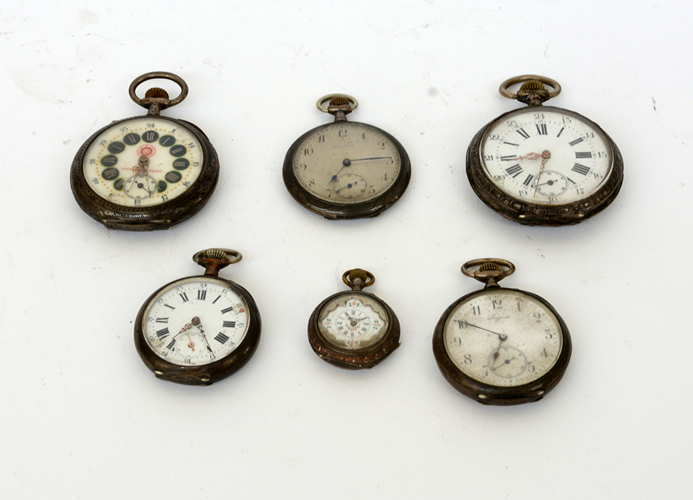 Lotto composto da sei orologi da tasca in argento con quadrnti in smalto, decori e dimensioni diversi (difetti)