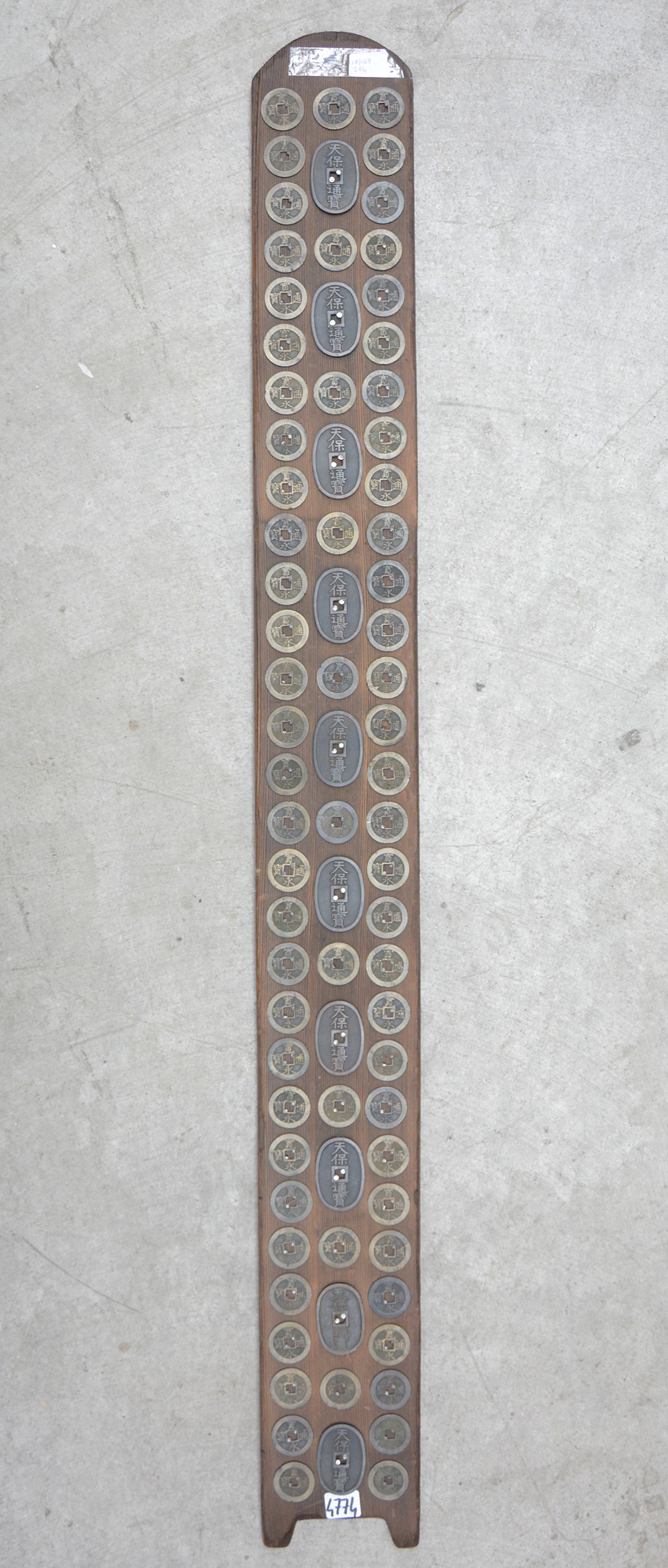 Gruppo di monete in metallo di manifattura cinese, dalla forma rotonda e ovale, con apertura quadrata al centro. Montate su supporto in legno. Cina, sec. XX