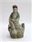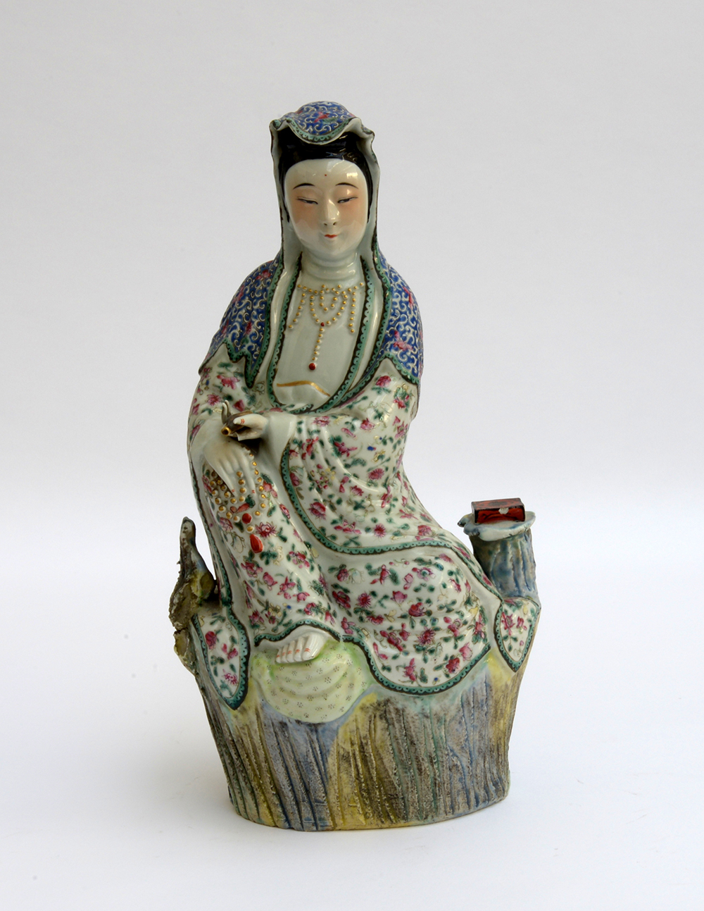 Guanyin in porcellana Famiglia Rosa, raffigurata seduta su base rocciosa...