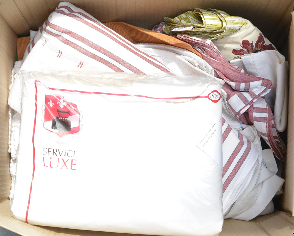 Lotto di biancheria per la casa (tovaglie, tovaglioli ed altro in tessuti diversi. (difetti) un cartone