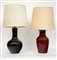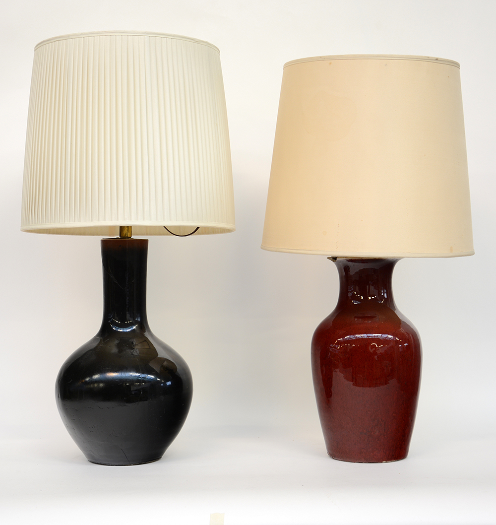 Lotto composto da due vasi in stile orientale a fondo nero e sangue di bue, montanti a luce elettrica (difetti, restauti e mancanze)
