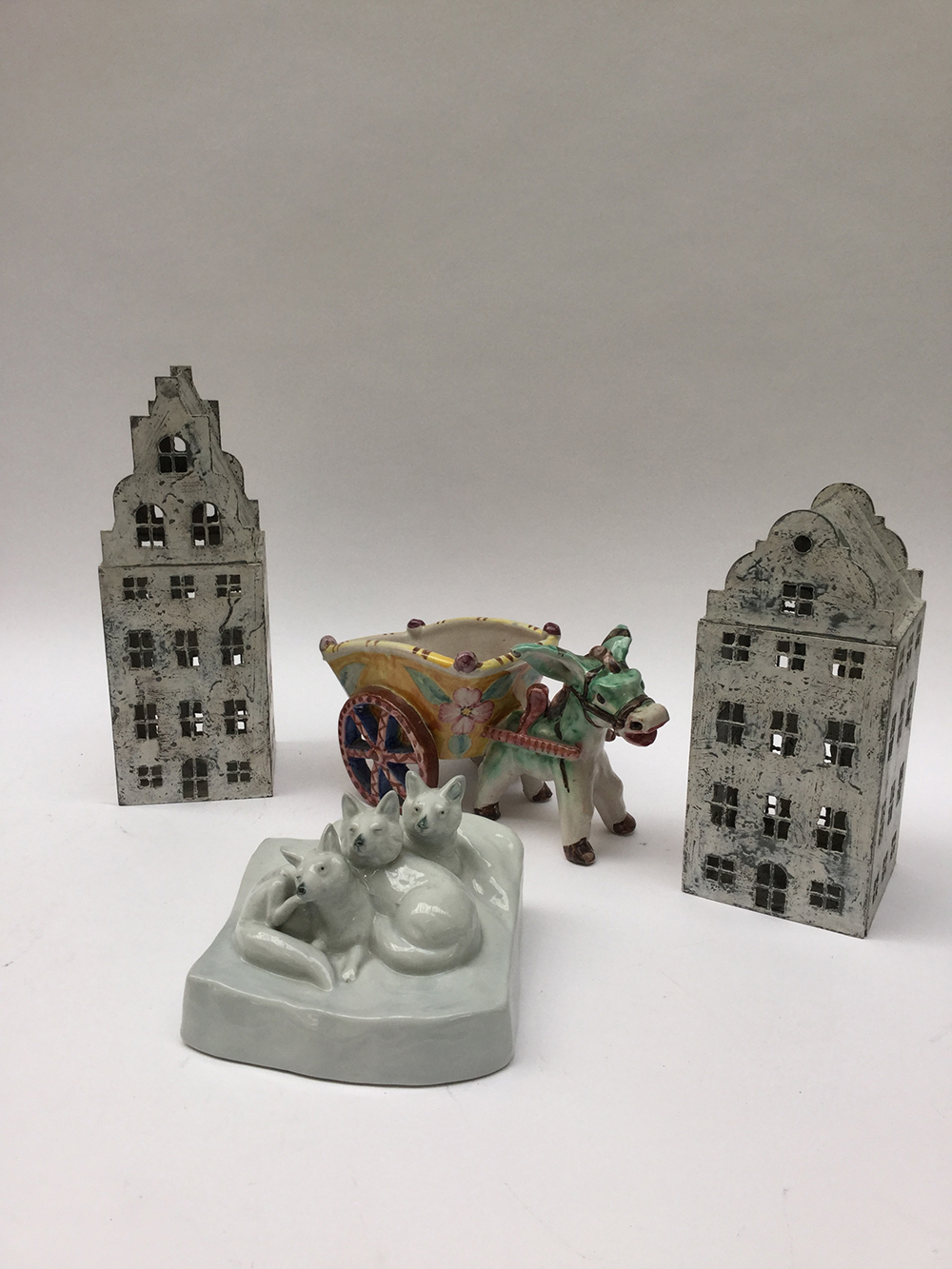 Lotto di due porta lumi a forma di casette e due gruppi in porcellana raffiguranti asino e volpi. Manifattura tedesca, prima metà secolo XX.