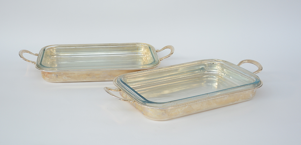 Lotto composto da una coppia di vassoi biansati, in metallo argentato a corpo liscio