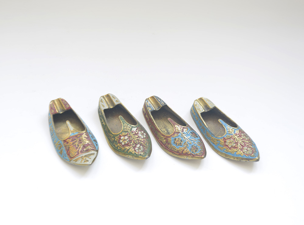 Quattro posaceneri in ottone smaltati a forma di scarpa