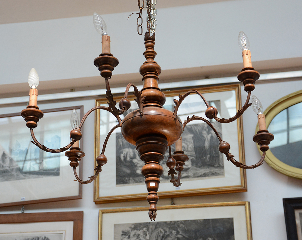 Lampadario a sei luci con fusto in legno tornito e braccia in metallo sagomato (d cm 80) (lievi difetti)