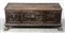 Piccolo cassone in legno dolce a tinta scura con formelle intagliate e...