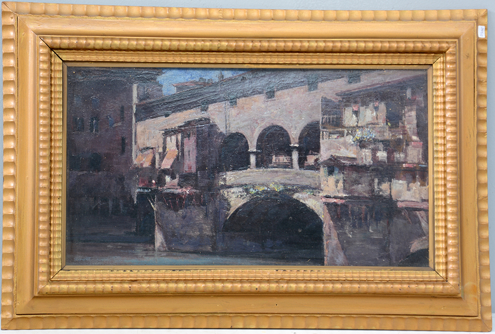 Guido Somelli (Firenze 1881 - 1940) "Firenze, il Ponte Vecchio" olio su cartone pressato (cm 28x50) firmato e titolato al verso, in cornice (lievi difetti)